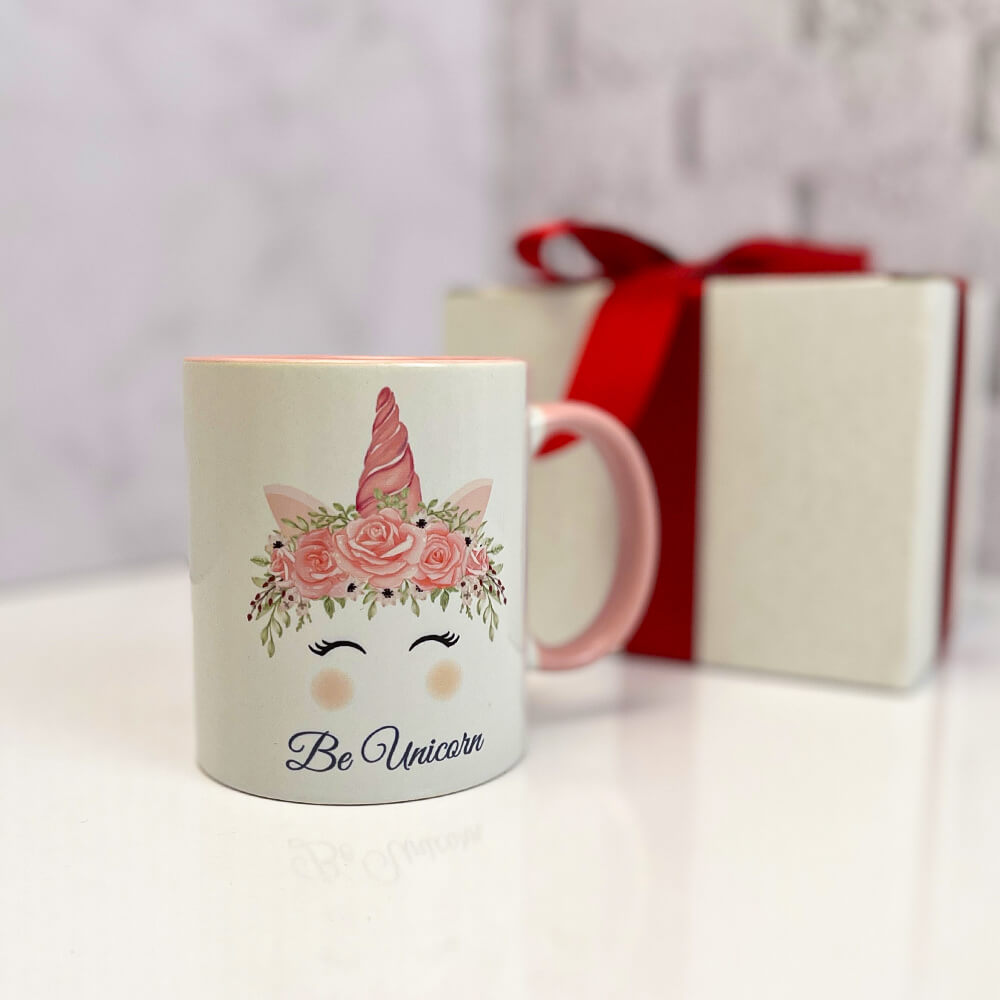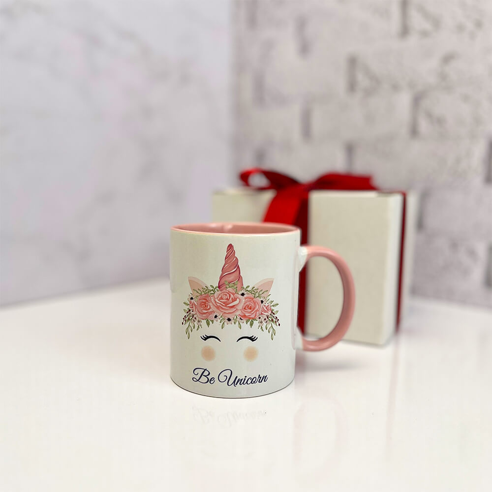 ماگ سرامیکی با چاپ یونیکورن و رنگ داخل و دسته صورتی