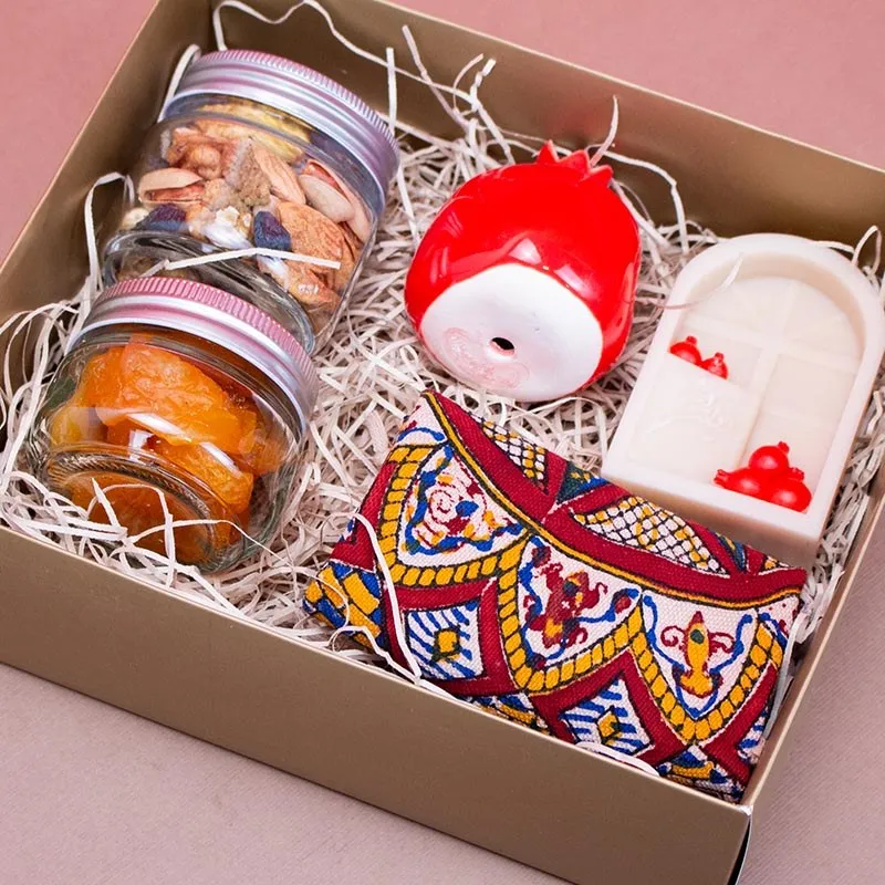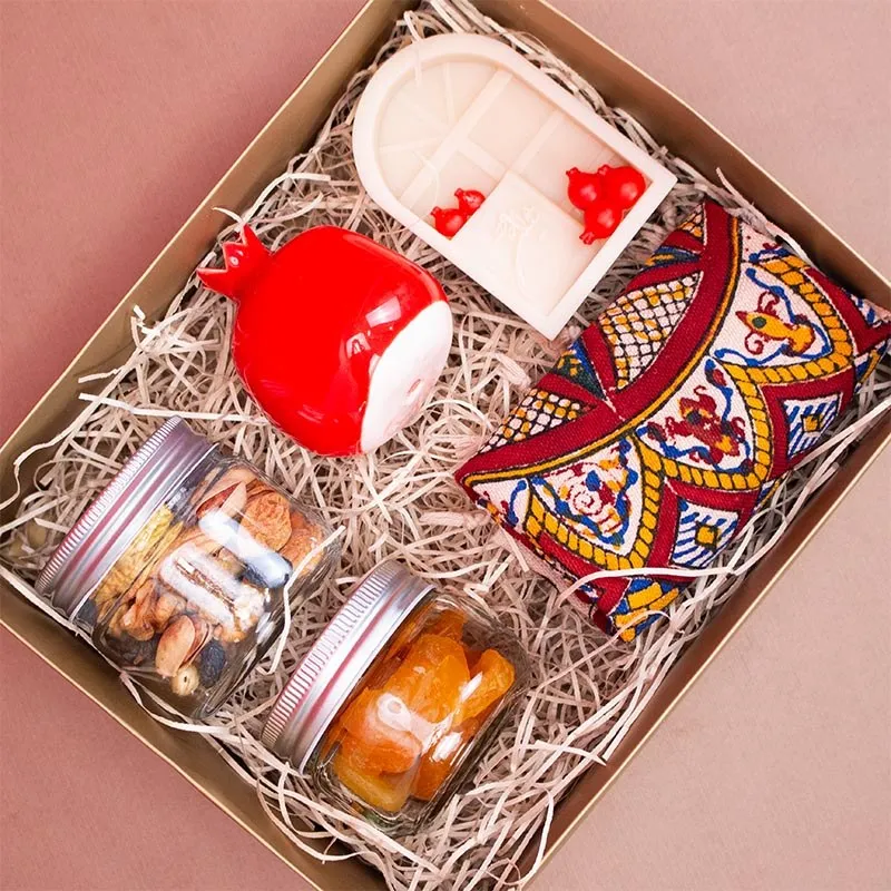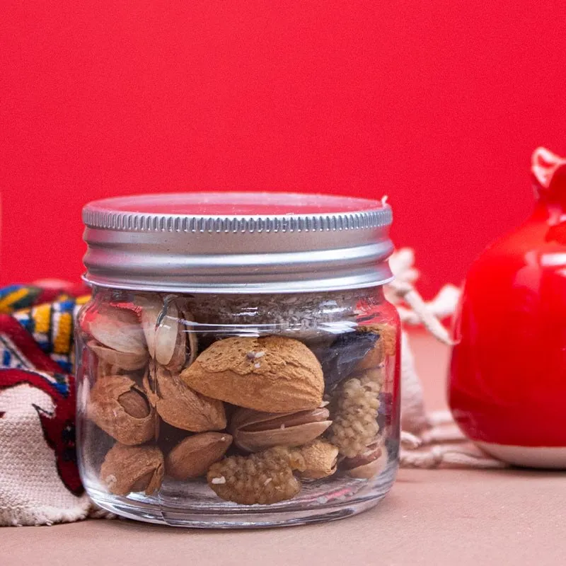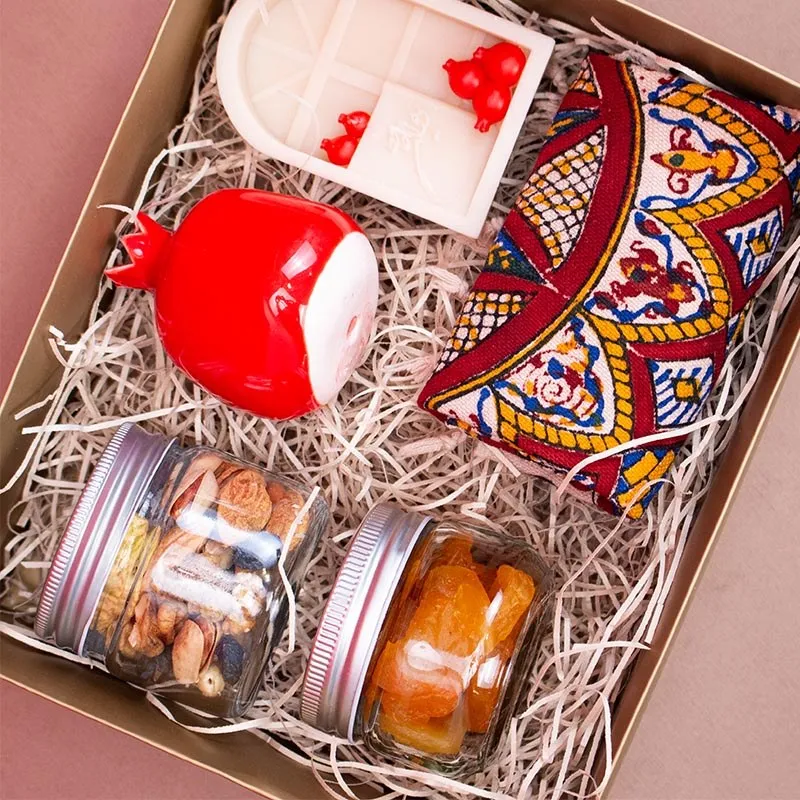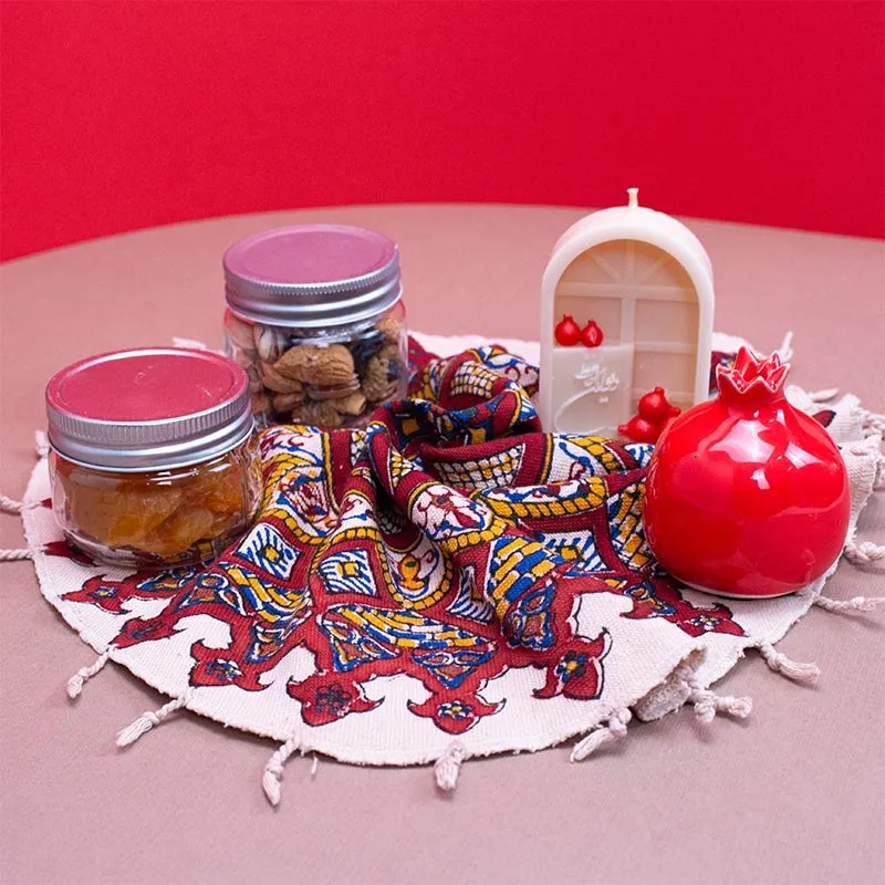 شیشه کوچک آجیل یلدایی/شیشه کوچک زردالو/رومیزی گرد 40cm/انار سفالی/ شمع یلدایی میباشد