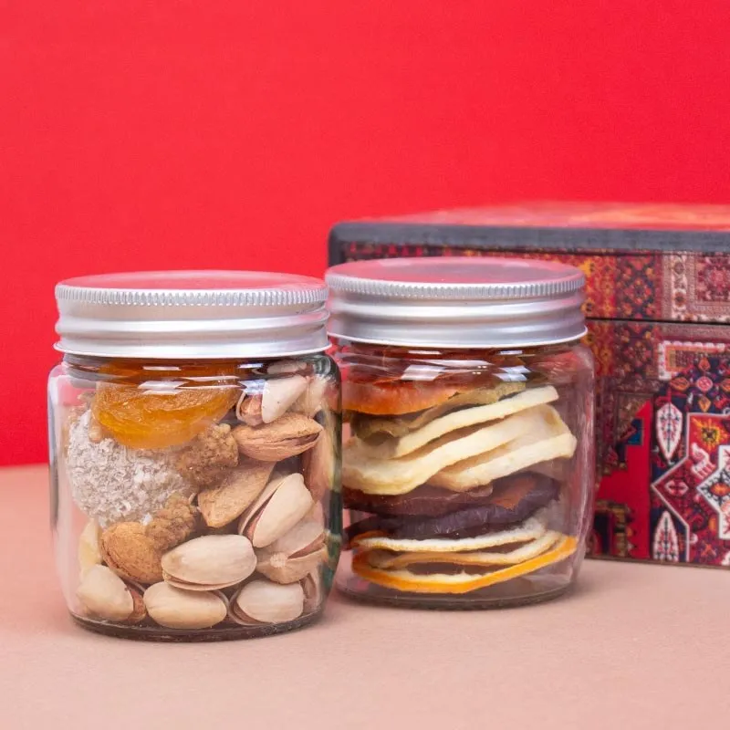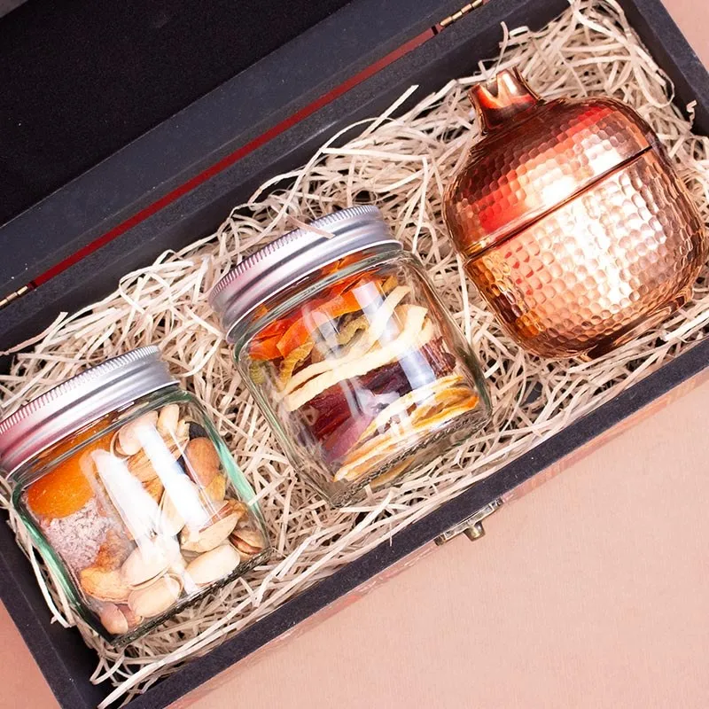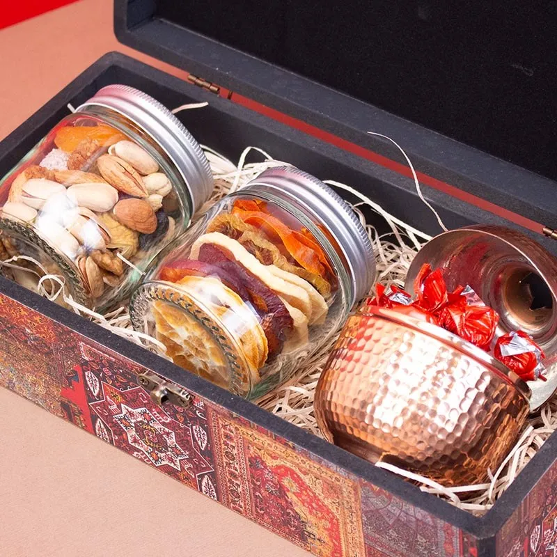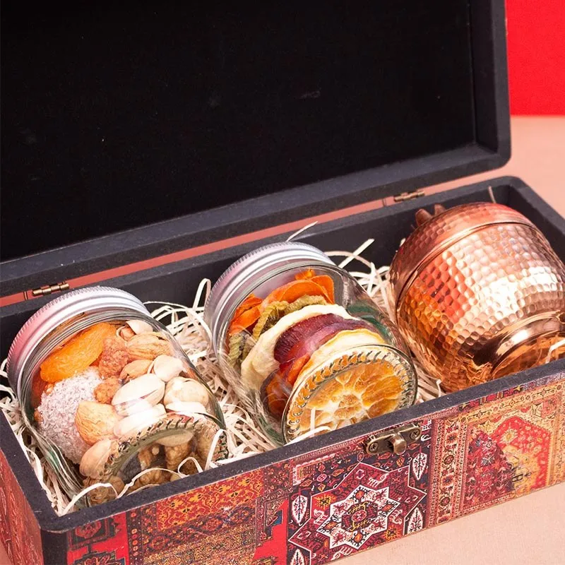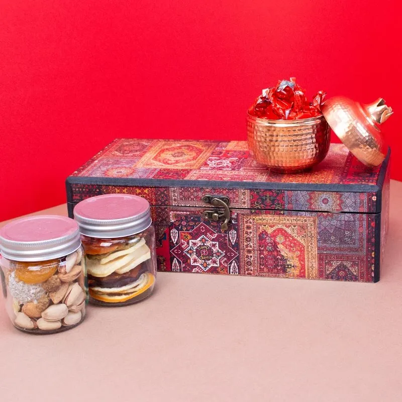جعبه چوبی30*15/شیشه کوچک آجیل مخلوط یلدایی/شیشه کوچک میوه خشک / انار مسی پر شده با شکلات میباشد