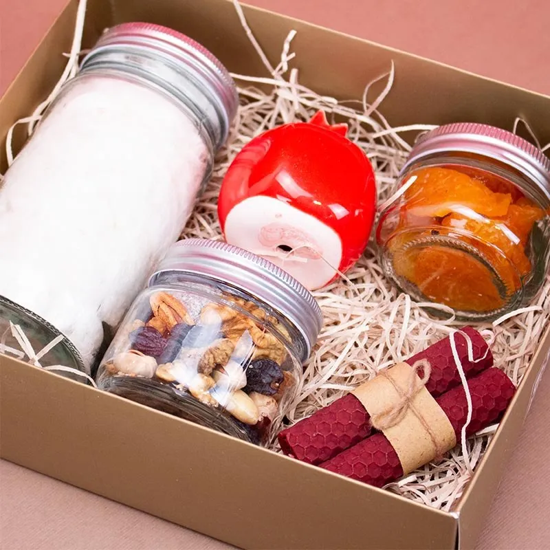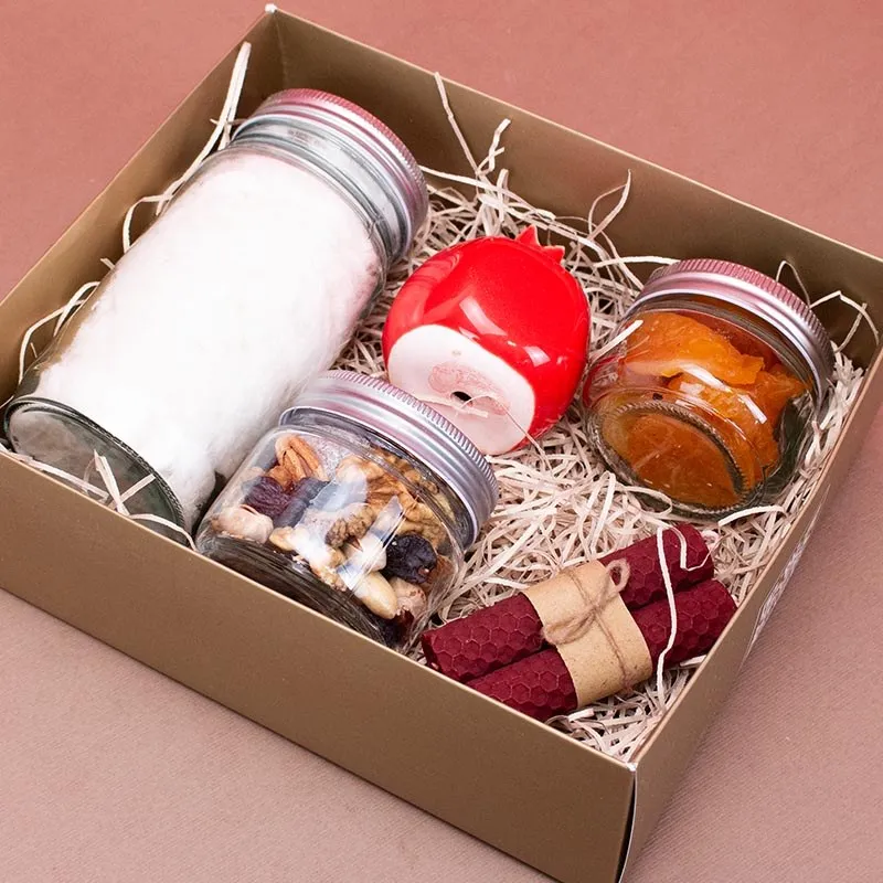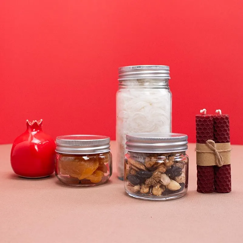 شیشه کوچک اجیل یلدایی/شیشه کوچک زرد آلو/شیشه متوسط پشمک/انار سفالی/شمع بیزوکس میباشد