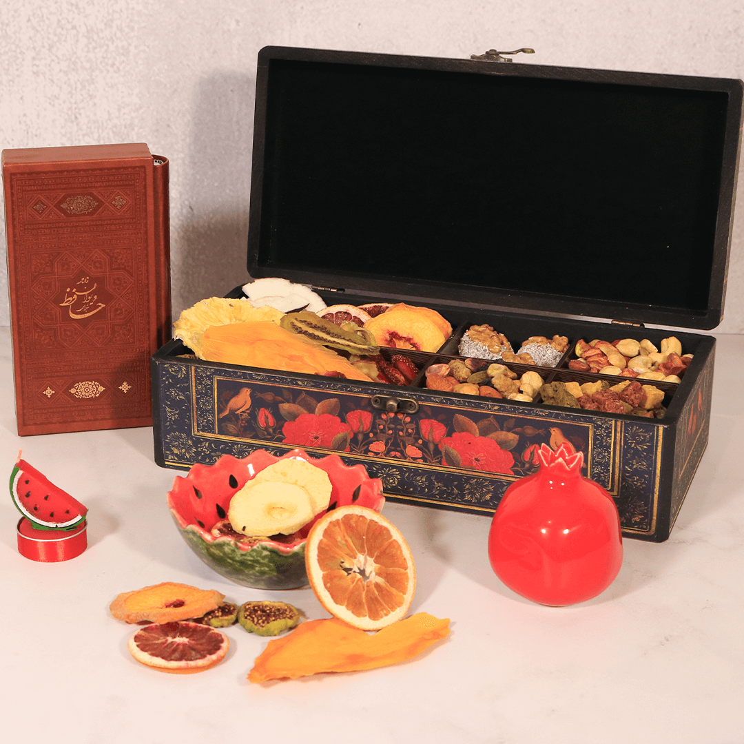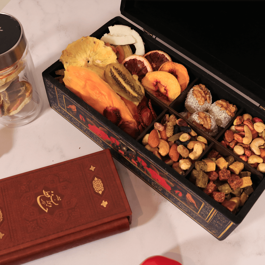 محتویات باکس: میوه خشک لوکس، مغز آجیل درجه یک، باسلوق، کیوبی